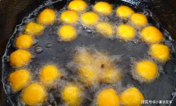 第三步,鍋中油燒熱,將紅薯丸子搓圓,下鍋煎至丸子浮上表面呈金黃色。