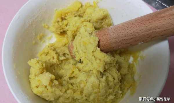第二步,紅薯蒸熟取出,瀝幹多餘水分,趁熱加入白糖攪拌融化,稍涼後加入面粉拌勻成粘稠的面團。