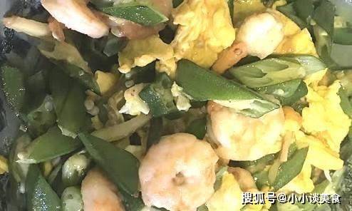 這時鍋裡倒少許油,先把雞蛋放入鍋裡,炸至金黃色備用,蝦仁放入沸水中,變色後撈出,再放入少許油平底鍋,加入秋葵,快速攪拌。秋葵炒至碎後,加入鹽、雞精、蝦仁和煎好的雞蛋。