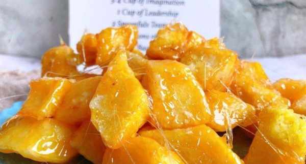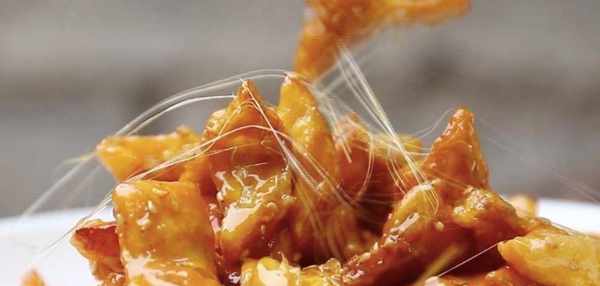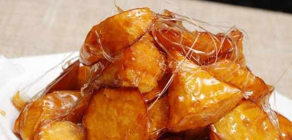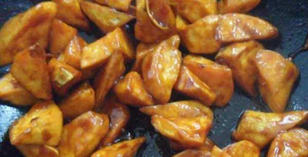 第四步,加入紅薯,攪拌均勻,塗上糖漿,然後關火,起鍋。稍微冷卻後,您可以拉出碎片。