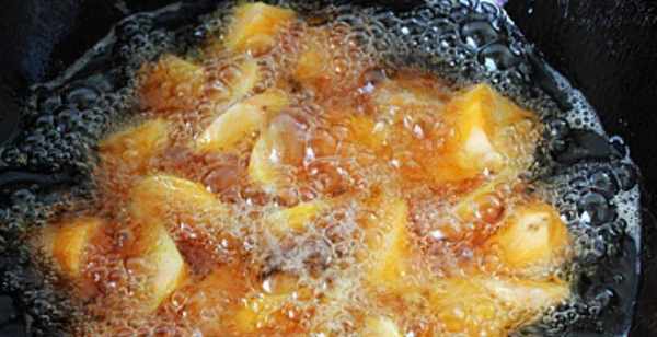 第二步,鍋中油燒熱,油溫升高,將紅薯放入紅薯中炸透撈出。