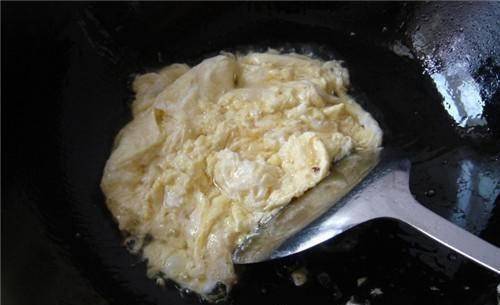Step2:接下來準備要打的雞蛋,將雞蛋放入碗中,加入少許水軟化,快速打好雞蛋備用。起鍋後立即在鍋中倒入適量的油,待油熱後倒入雞蛋,然後用小火快速將雞蛋煎至變硬,迅速從鍋中取出。