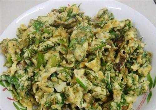第三步:再次起鍋,這次先炒小茴香,鍋裡倒油,小茴香下鍋炸,小茴香快炸,快熟瞭,倒入事先煎好的雞蛋,然後快速拌勻,加入適量的鹽,再次拌勻後關火,將茴香和雞蛋放入碗中,即可食用。