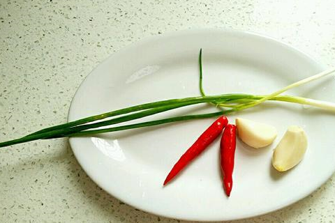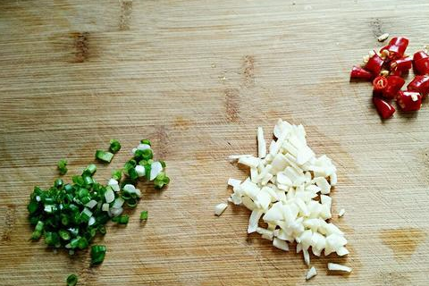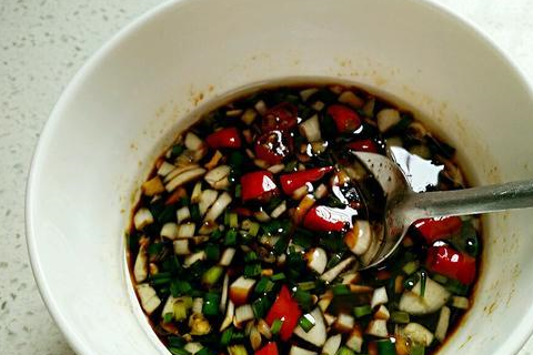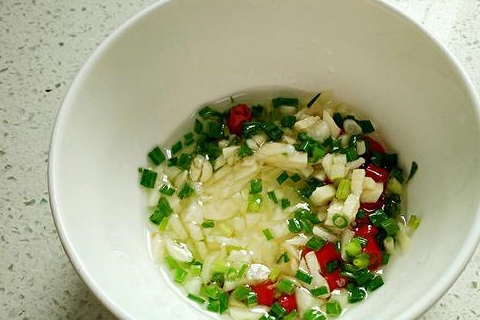 8.凈碗裡裝入蔥花、蒜粒、小米椒結,淋上熱油。