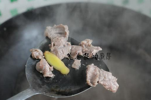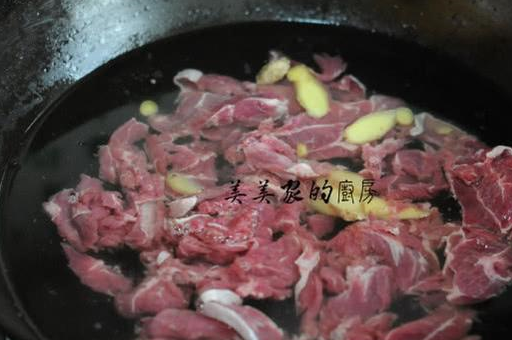 鍋裡放入冷水,將牛肉片倒入鍋中,撒入薑片一起汆燙至變色。