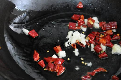 油鍋燒熱,將蒜末和剁辣椒放入鍋中,炒出香味。