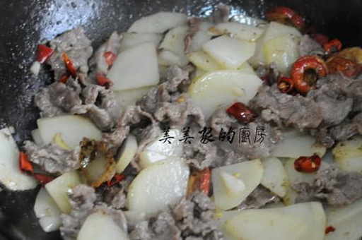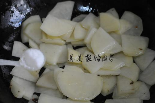 將炒好的牛肉盛出來,鍋裡放油,燒至五成熱後倒入土豆片,加鹽,中火煸炒至土豆片變得透明。