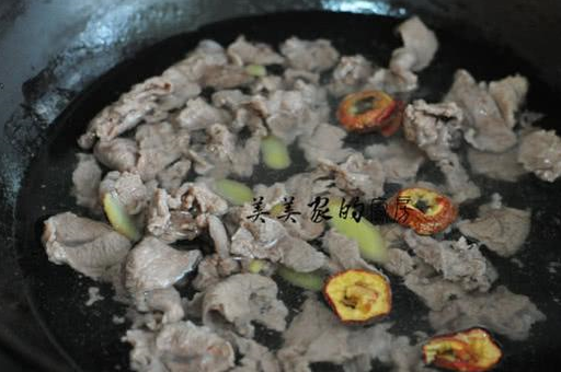 將處理好的牛肉片倒入鍋中,加入適量清水河山楂(山楂可以進一步去除牛肉的腥味,還能讓牛肉更快熟爛。)