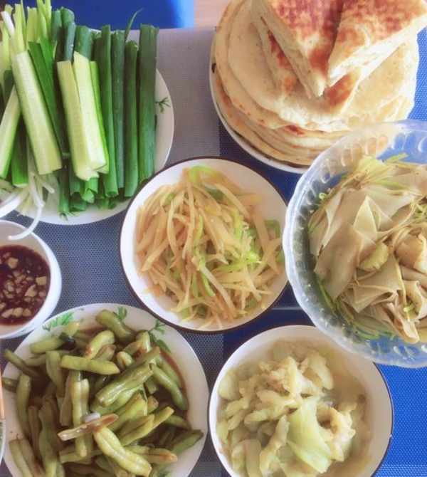 第二款:烙餅+炒米皮+土豆絲素炒+炒豆角+炒絲瓜+鮮肉包子