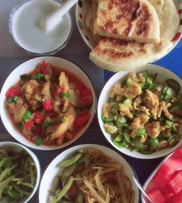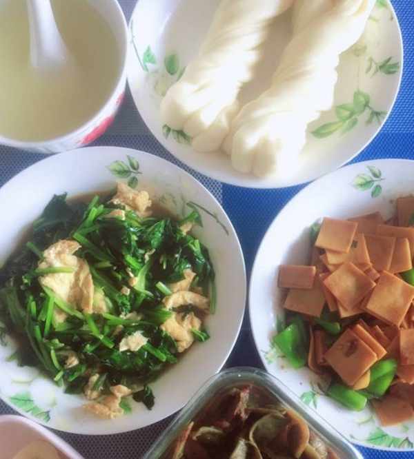 ?第八款:擰花發面卷+青菜炒雞蛋+柿子椒炒豆皮+土豆炒木耳