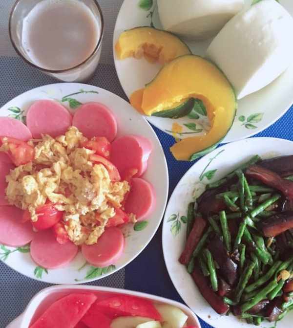 第七款:發面饅頭+煮南瓜+花生核桃豆漿+西紅柿炒雞蛋+茄條炒豆角?