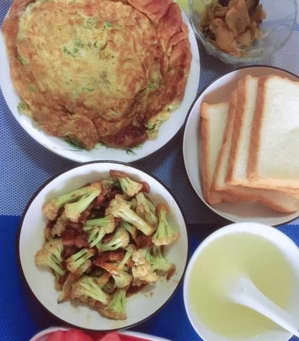 第四款:雞蛋餅+吐司面包片+肉末炒花椰菜+綠豆湯