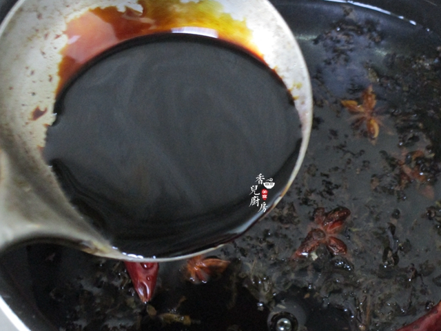 4、煮雞蛋的同時,另起鍋註入2大碗清水,把紅茶,八角和幹辣椒倒入,再把生抽醬油和老抽醬油入鍋加蓋大火燒。