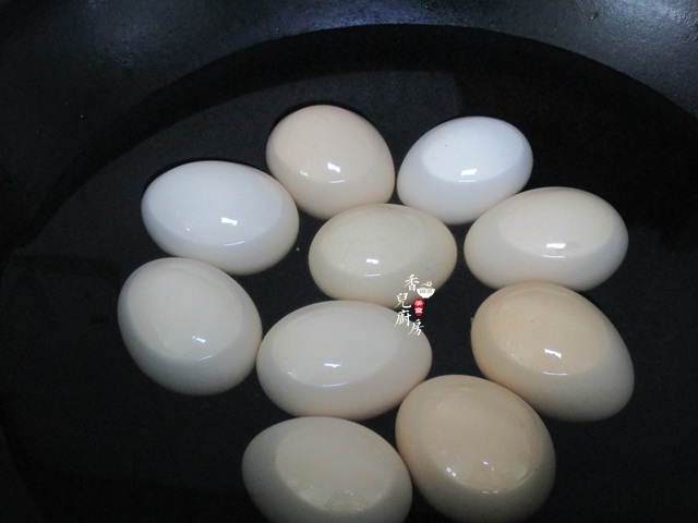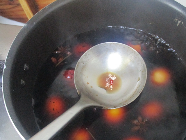 6、之後把雞蛋入鍋,用勺子把每一個雞蛋都輕輕的敲幾下,便於入味,蓋上大火燒開用小火再煮15分鐘後即可熄火。熄火後不要立即撈起,等涼透瞭再撈起會更入味,我們都是吃一個撈一個,泡的時間越久會更入味。