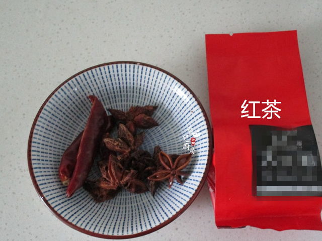 2、備好紅茶,八角和幹辣椒。