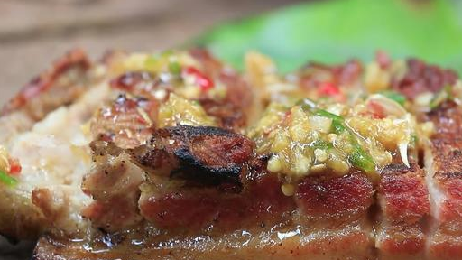 煎這塊肉的空檔,他又去準備吃五花肉的蘸水瞭,把辣椒、檸檬、大蒜放在裡面弄碎。