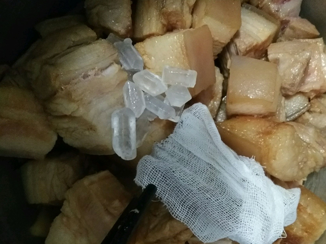 3、接著加入稍微多一點的生抽、用筷子攪拌均,然後放入胡椒粉、生薑、冰糖、八角、香葉、桂皮、花椒、幹辣椒。其中八角、香葉、桂皮、花椒、幹辣椒都放在紗佈包裡瞭。電飯鍋中加入適量的開水,水量剛剛沒過肉的位置或者稍低一點就可以。