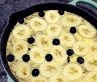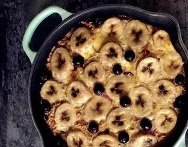 第三步,將燕麥糊倒入局飯碗,放上香蕉片和藍莓裝飾,表層撒少許椰蓉