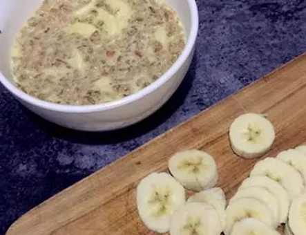 第二步,把香蕉泥倒入燕麥中,加入牛奶攪拌均勻