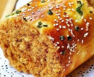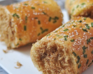 肉松面包:牛奶放入容器中,加入雞蛋、白糖、鹽。最後倒入面粉和酵母,廚師機選擇一檔揉面,揉成團之後改二擋黃油切成塊,室溫融化面團揉出筋之後倒入黃油繼續揉面,揉15分鐘左右,出手套膜面團取出來放到容器中,蓋保鮮膜發酵發至兩倍大小,手指蘸幹面粉從中間摁下去會有一個不會回縮的孔,代表面團發酵完成取出面團,放在揉面墊上,進行排氣搟成長方形烤盤上墊上一張油紙搟好的面放在烤盤上用叉子紮出一些孔放入烤箱中,底端放一盆開水,進行二次發酵小蔥洗幹凈切成段烤箱180度上下火預熱二發好的面上面刷一層蛋黃液撒上香蔥和白芝麻放入預熱好的烤箱180度烤12分鐘即可程序結束後,取出烤好的面包,噴上一些水,用保鮮膜蓋住,這樣保證面包表皮的濕度,卷的時候才不會開裂甚至斷開面包晾涼之後,倒扣,兩端用刀劃一下,不要劃斷刷一層沙拉醬,撒上肉松將面包卷起來,用油紙緊緊包裹,兩端擰緊進行定型約5分鐘後,去掉油紙,將面包切成段兩端刷上沙拉醬,蘸上肉松好次的肉松卷做好瞭