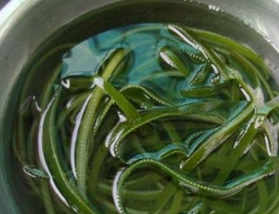 將浸泡好的海帶,然後用刀把它切得稍微短一些,在鍋裡加入適量的清水,燒熱之後再加入適量的食用油和醋,將處理好的海帶放到鍋裡焯水,兩分鐘之後把海帶撈出來,瀝幹水分,放到一個大一點的盆中。