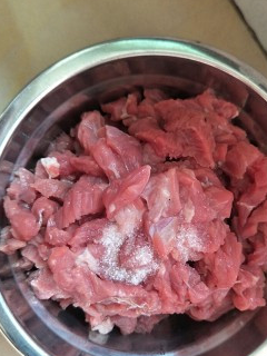 1.將牛肉絲按照筋的反方向切斷筋,不要在筋的相同方向切,否則一會兒炒出來牛肉絲咬不動。放入少許的鹽。