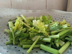 3.芹菜清洗幹凈,然後切成條狀,再放入少許的鹽,攪拌一下。