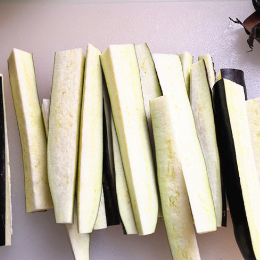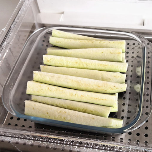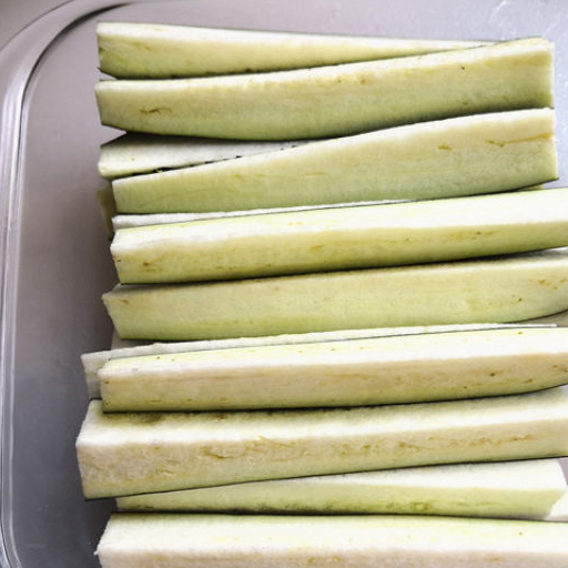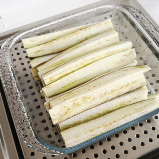 第2步、取一隻耐高溫的容器,將切好的茄子條整齊地擺放在裡面。