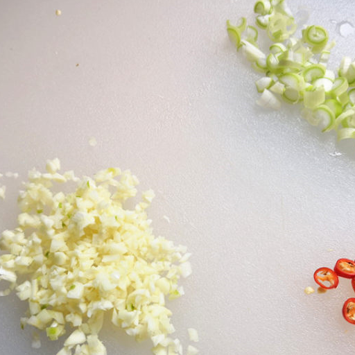 第9步、大蒜去皮切末,蔥花切好,小米辣切末。