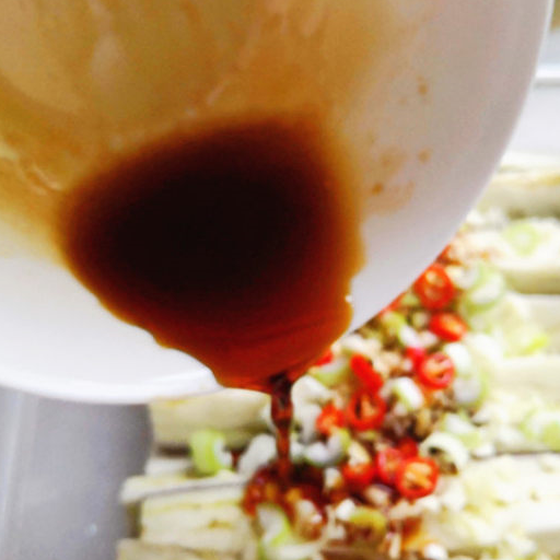 第13步、再取適量的食用油放到鍋裡燒熱後澆到茄子上,香味四溢啊,吃的時候拌勻就可以啦,超開胃。