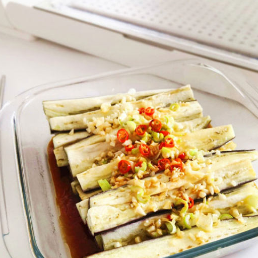 第1步、茄子清清洗幹凈,去掉兩頭,然後分成與容器長度相近的條,挑選茄子的時候,不要選茄子皮特別亮的,那樣的茄子皮比較厚,也不要選茄子皮發烏的,那樣的茄子是老茄子,要選表皮有光澤,用手按壓的時候感覺有彈性的,這樣的茄子比較嫩,好吃。