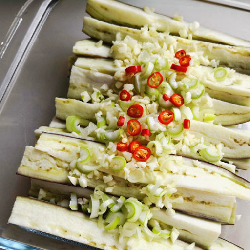 第10步、將大蒜末、蔥花、小米辣放到茄子上。