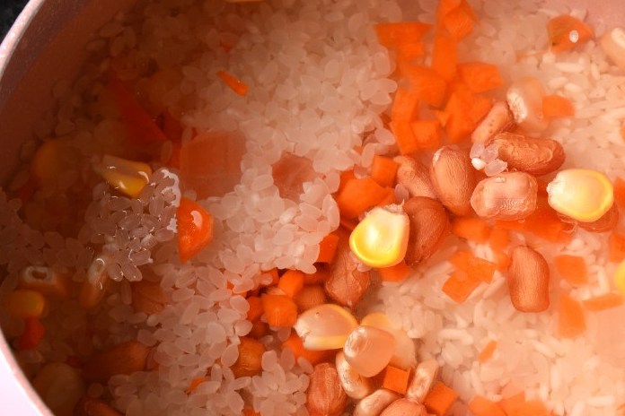 第二步:鍋中註入500毫升水,將糯米、大米、花生米、玉米粒和切好的胡蘿卜粒倒入鍋中,開大火煮30分鐘。轉小火,將冰糖倒入鍋中均勻攪拌,再煮5分鐘即可出鍋。