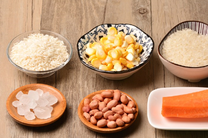 食材:胡蘿卜80克,玉米30克,大米100克,糯米50克,花生30克,冰糖8克。