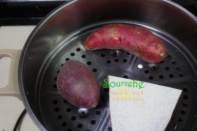 第二步芋圓的制作過程:紫薯、紅薯、紫芋,分別洗凈放入蒸鍋,隔水蒸熟。建議用蒸的比煮的更好,水分少,更適合做芋圓。