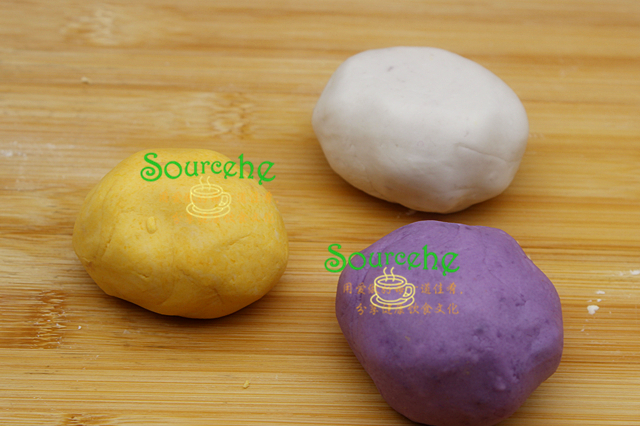 木薯粉均勻的分三等分,分別倒入紫薯泥、紅薯泥、紫芋泥的碗裡,加入煮沸的糖水,攪拌均勻,揉搓光滑的面團。