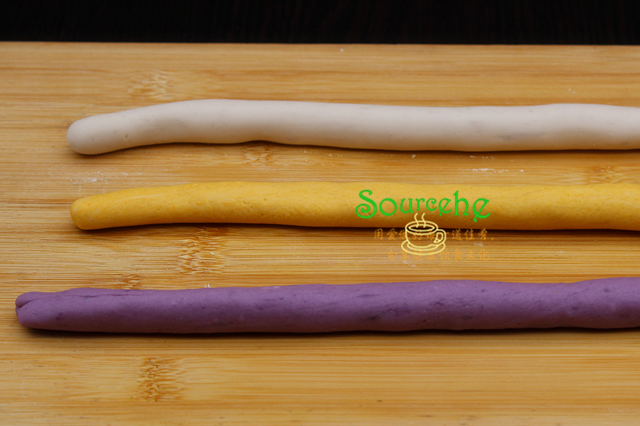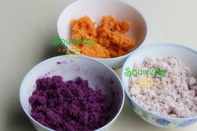 蒸熟的紫薯、紅薯、芋圓、分別去皮,用搟面杖搗碎成泥,分三個碗裝好。搟面杖搗碎的時候記得每個次要清洗,避免顏色混合。