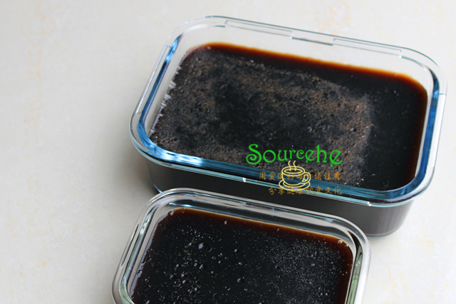 煮沸好的仙草,倒入玻璃保鮮盒,冷卻之後,放入冰箱冷藏口感更佳。保鮮盒建議用長方形或正方形,切出來仙草塊的形狀比較好好看。
