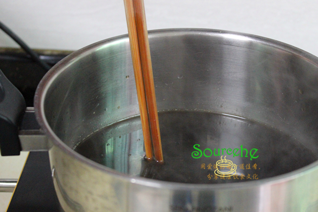 第一步仙草的制作過程:50克仙草粉加200克的水攪拌至無顆粒狀,1000克的清水倒入煮鍋煮沸,接著把攪拌均勻的仙草粉倒入煮鍋,餅用筷子不斷攪拌均勻,再次煮沸。
