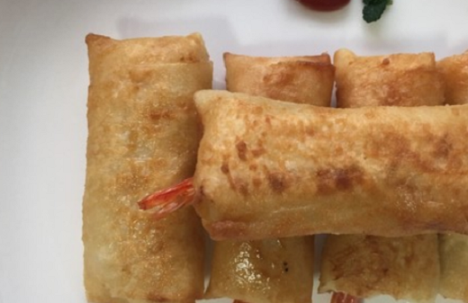 3.將春卷皮內放入蝦肉和土豆泥卷起來,放入油鍋炸上兩三分鐘,直至兩面金黃為止,即可食用。
