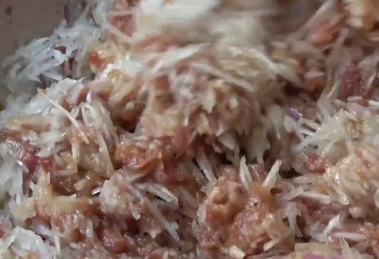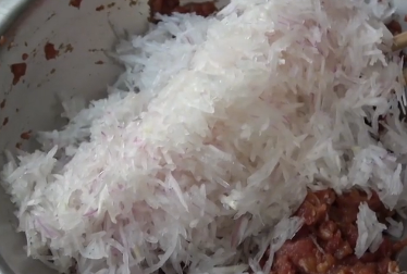 洋蔥去皮,清洗幹凈,用擦絲工具擦成絲,然後再改刀切碎。然後裝進肉餡裡。