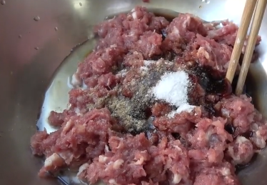 利用醒面的時間,調餃子餡。前腿肉去皮,清洗幹凈,剁成肉末,裝進碗裡。然後往肉末裡加入花椒水,鹽,醬油,蠔油,胡椒粉,往一個方向攪拌均勻,醃上10分鐘。