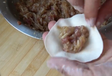 面團取出,再揉10分鐘左右,然後搓成長條,切成大小相等的劑子。搓圓,壓扁。搟成中間厚兩邊薄的面皮。包上調好的洋蔥餡。