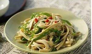這裡的歌詞就是我們平常吃到的豆腐皮。首先將豆腐皮清洗幹凈,然後用刀切成絲,然後準備一個杏鮑菇切成絲,將辣椒切成絲,放置備用。首先我們在鍋中加入適量的油,油溫五成熱,將辣椒絲放入鍋中炒香,最後加入切好的杏鮑菇,翻炒均勻之後,最後加入豆腐皮,加入適量的鹽即可出鍋,豆腐皮中含有大量的蛋白質和鈣元素,尤其是老人和小孩。多吃一點對骨骼非常好。