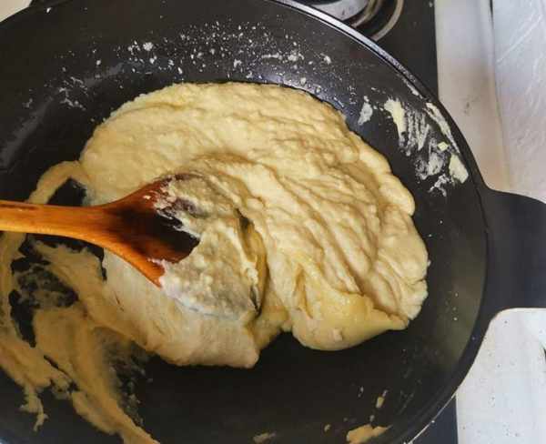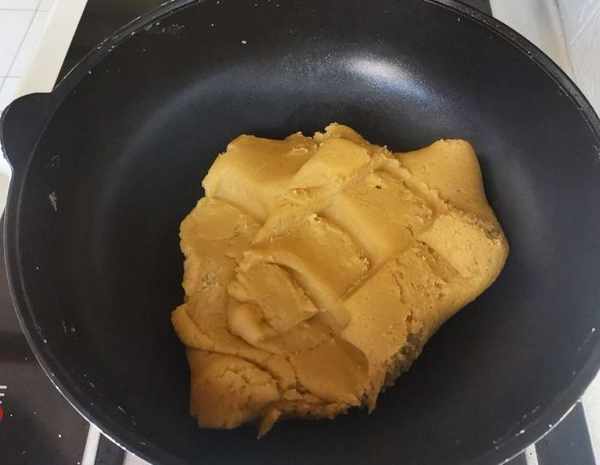 第三步:把栗子泥倒入不粘鍋,放入白糖和玉米油翻炒,小火慢慢的炒制。