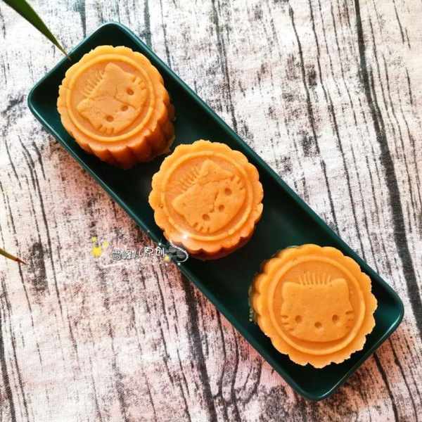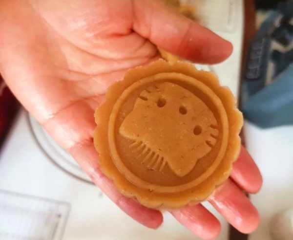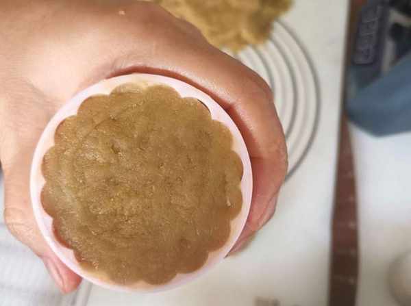 第五步:這時候拿出炒好的栗子泥,分成小劑子,放到月餅模具中,壓出來。