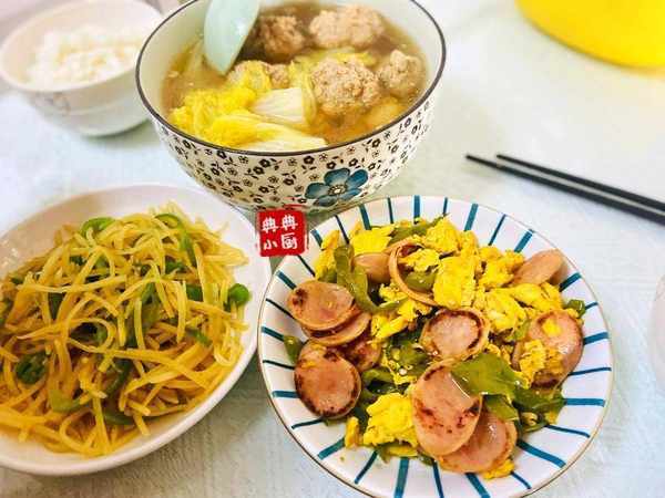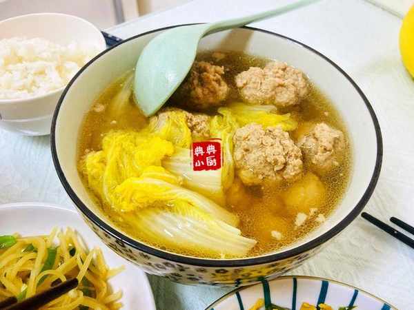 還有一個湯,小朋友點名要吃的,娃娃菜肉圓湯。最近她說娃娃菜比雞毛菜好吃,說娃娃菜甜絲絲的,好吧,隻要她願意多吃點蔬菜,什麼樣的都行瞭。她爸爸說,主要還是需要有肉,放排骨裡,燒葷湯她就會吃,你不信試試直接炒娃娃菜,你看她吃不吃?果然,親爸還是很瞭解她的。