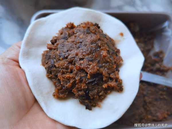 第四步:拿面皮,放上多一些的豆餡兒,像捏包子一樣收緊口。
