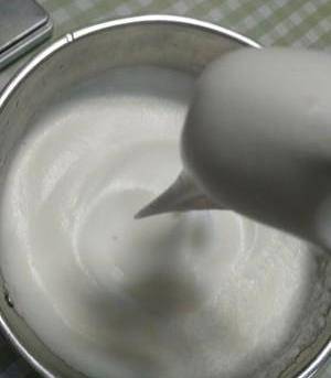 蛋清裡加入鹽、檸檬汁蛋清先用筷子把蛋清攪幾下,然後用電動打蛋器打發,白糖分三次加。蛋清要打發到非常細膩,提起打蛋器不會滴落