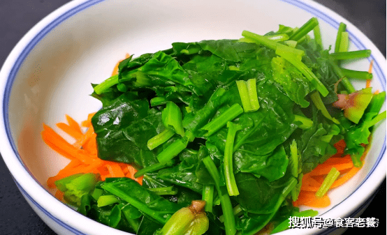 菠菜泡好後再用清水清洗幹凈,控幹水分,放在菜板上切成小段。鍋中水開之後,把胡蘿卜絲倒入鍋裡面,焯水一分鐘,時間到瞭控水撈出,放入碗中。再把菠菜倒入鍋中焯水30秒,控水撈出來,和胡蘿卜絲放在一起